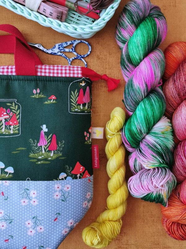 Deze handgemaakte project bag is perfect voor grotere haak- of breiwerken. Met ruimte voor ca. 700-750 gram wol biedt hij volop plek voor grotere projecten zoals truitjes, sjaals of het begin van een nieuwe deken.