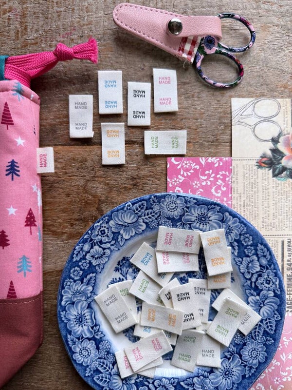 Met deze kledinglabels geef je je handwerk een mooie, persoonlijke afwerking. Ideaal voor zelfgemaakte kleding, accessoires of handwerkprojecten. Je kunt de labels met de naaimachine of met de hand vastnaaien. Ze zijn leuk om dubbel te vouwen en in een zijnaad mee te stikken, zoals je ziet bij de project bag op de foto.