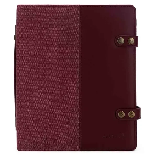 De kaft en bladen zijn bekleed met stevige canvas stof, afgewerkt met details van kunstleer en messingkleurig metaal. Het boek sluit met drukknopen, zodat alles goed op zijn plek blijft. Aan de binnenkant van de kaft vind je ruimte voor het opbergen van een rolcentimeter, borduurschaar, wolnaalden, accessoires én een notitieboekje met pen. Die accessoires zijn inbegrepen!
