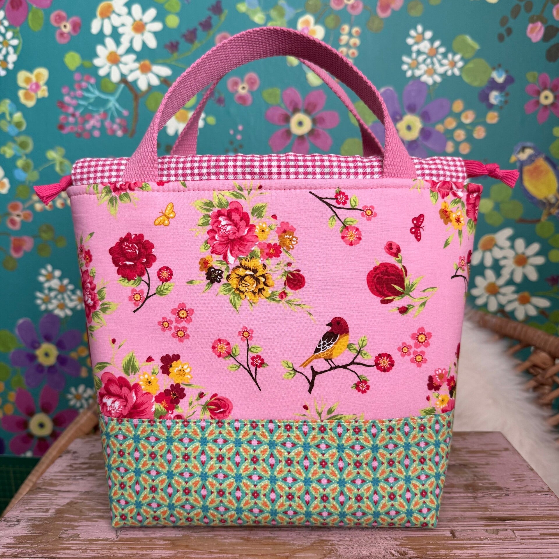 De voorkant van de tas heeft een patchwork deel met onder andere een koffie/thee kopjes print en de achterkant heeft een stof met bloemen en vogeltjes.