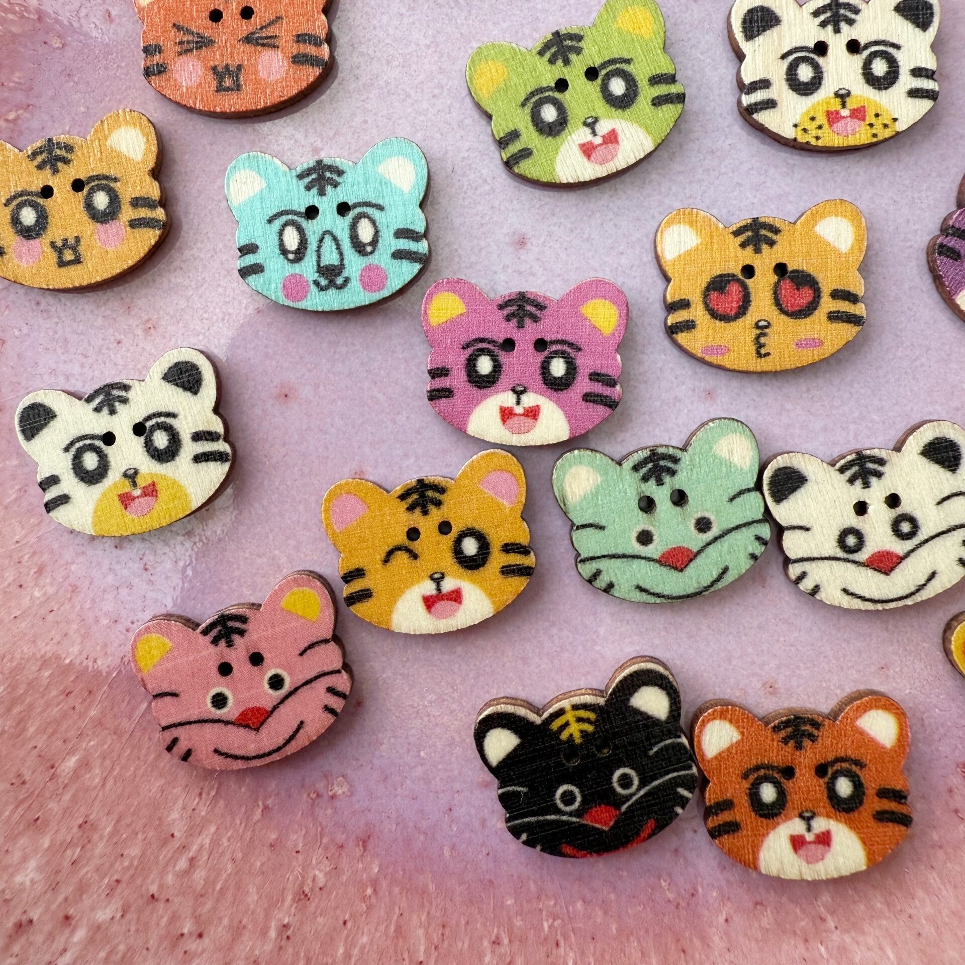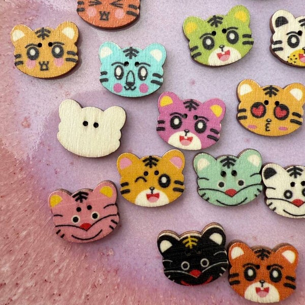 Deze stevige houten knoopjes hebben twee gaatjes en kun je met de hand aan te naaien. De kattenknoopjes zijn er in verschillende kleuren en printjes. Ik verkoop ze in zakjes van 10 verschillende knoopjes. Elk zakje is een beetje anders omdat er meer dan 10 printjes zijn.