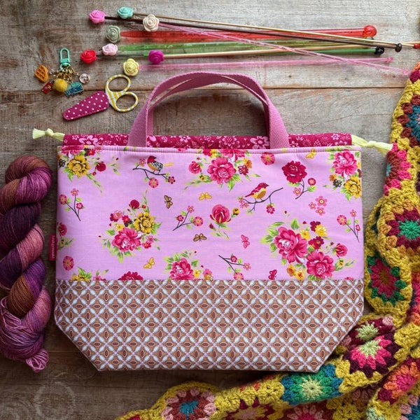 Deze project bag heeft 2 gezichten! De voorkant van de tas heeft een patchwork deel, terwijl de achterkant een mooie roze stof laat zien met bloemen, vogeltjes en vlinders. Inclusief een handige gesphaak om je progress keepers aan te hangen.